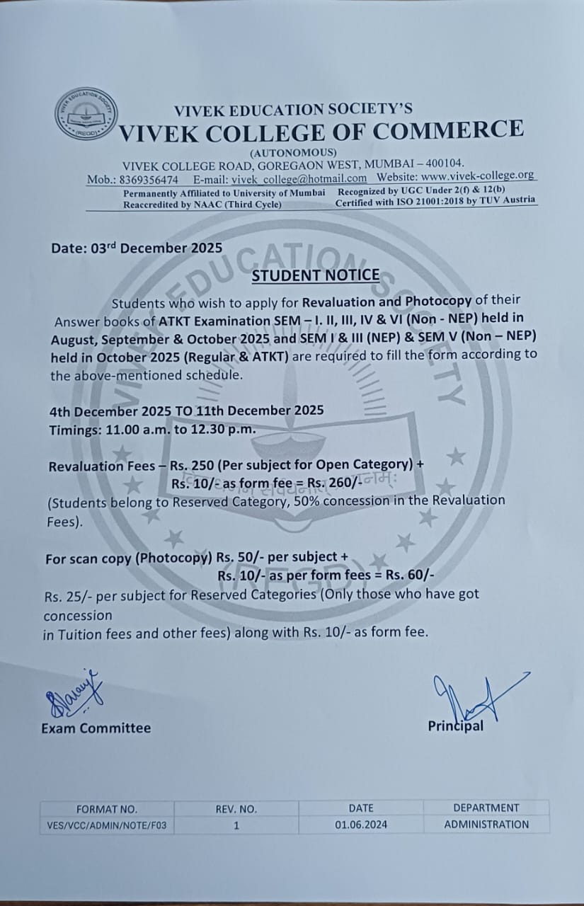 Vivek Education Society, a Charitable Institution set up in the year 1961, had established Vivek Vidyalaya in 1962 and followed it up by starting Junior College in the streams of Arts, Science & Commerce in 1976. Vivek College of Commerce was started in the year 1986. It is recognized as a vibrant institution working relentlessly for the cause of education..